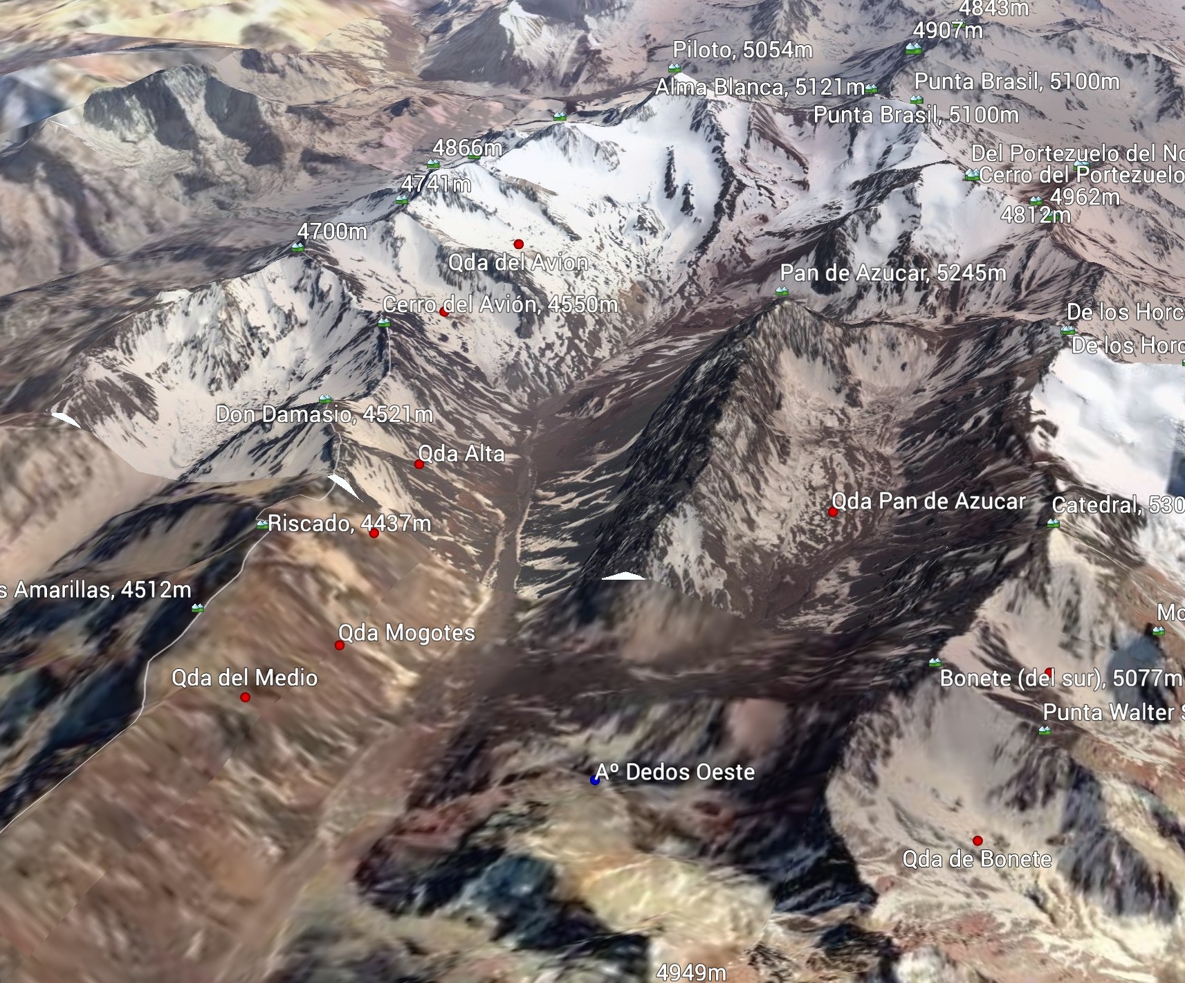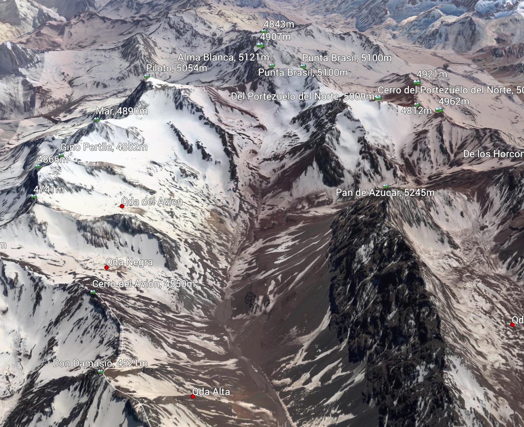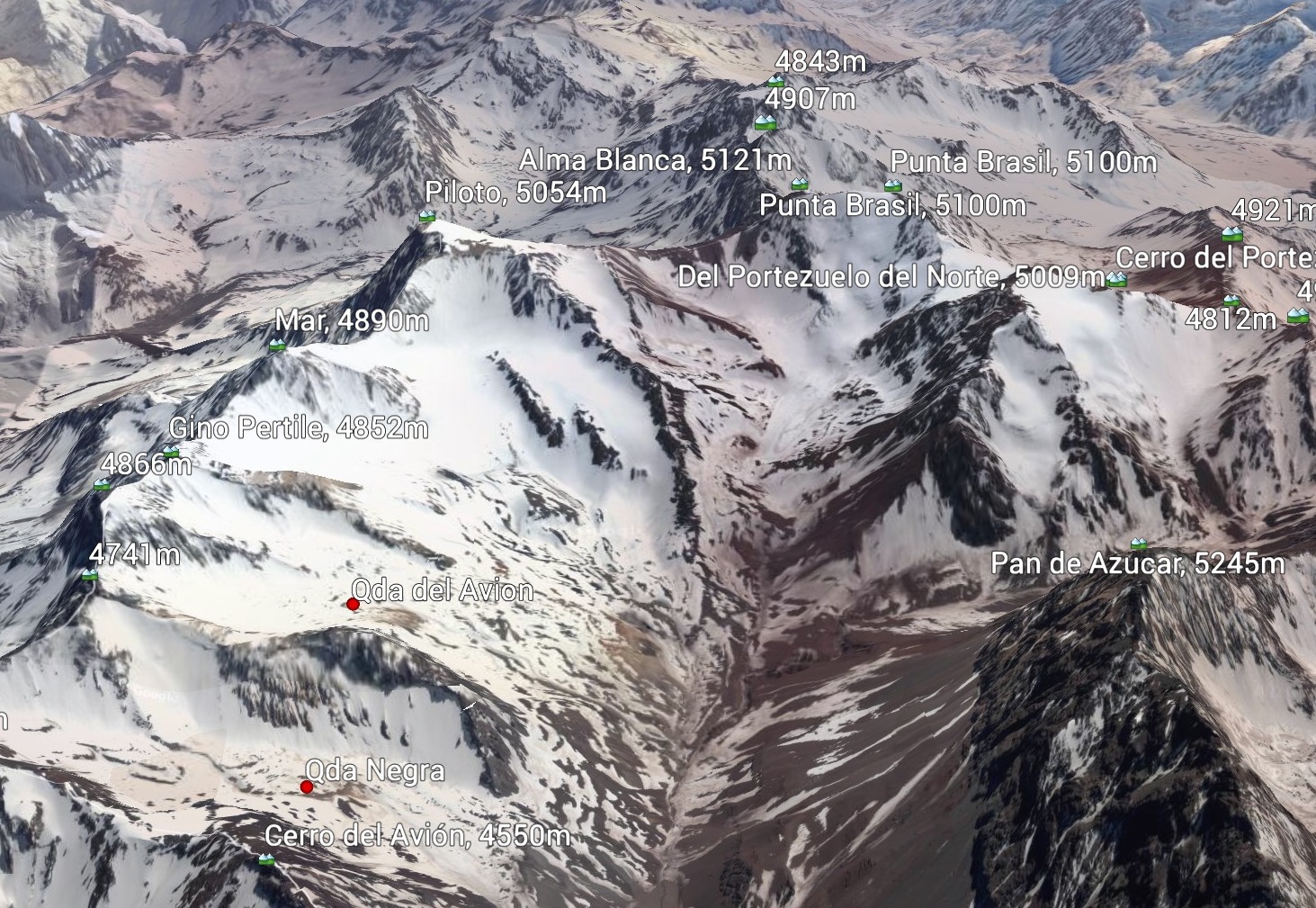 El Alma Blanca tiene dos cumbres: la principal (llamada tambien Cumbre Escuadrón 27 Gendarmeria Nacional) y la otra, Pico Brasil, ca 5 100m, escalada por el C A Carioca;