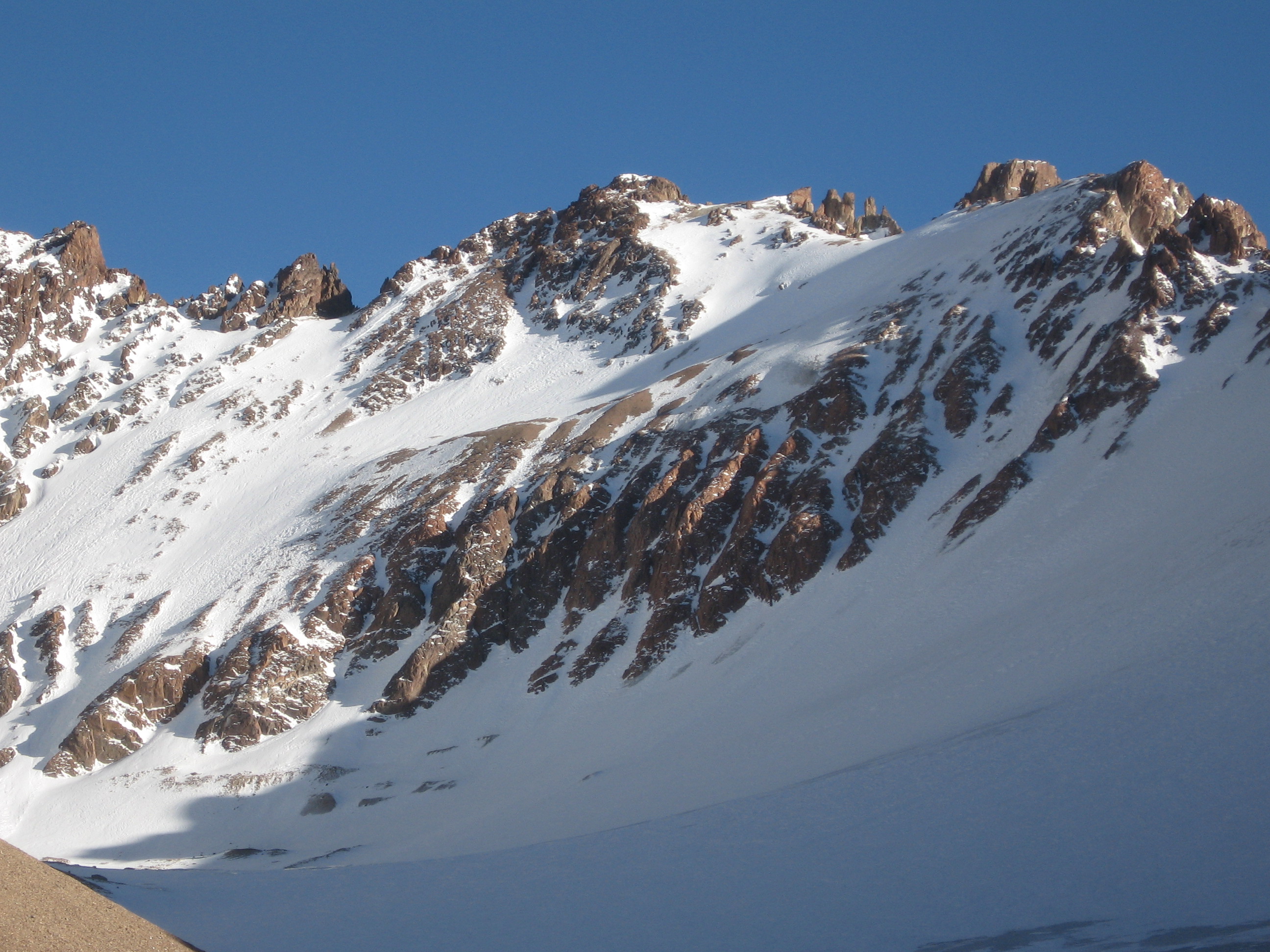 Cerro Junión 5.120m : Este hermoso cerro esta ubicado en la dorsal principal del Cordón del Plata. Para ingresar a este escondido sector hay que transitar por las Morenas Coloradas y a la altura del Pico Parra girar a las izquierda (sur) superando un Tapón Morena que esconde un antiguo circo glaciar actual Laguna.