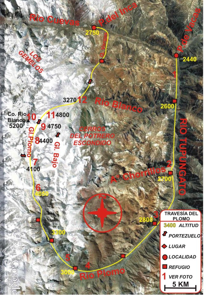 Acceso 1: La primera, parte de la misma ruta 7 entre las localidades de Penitentes y Puente del Inca. Se remonta un día la quebrada de Vargas atravesando el manso portezuelo Serrata para descender al valle del Río Blanco. Desde allí, se sigue hacia el glaciar Río Blanco, desde donde se pueden elegir varias vías posibles que en un día de ascenso y escalada permiten situarse sobre el legendario portezuelo Alto del Río Plomo: la “brecha” de Reichert, el “glaciar colgante” del Centro Andino Buenos Aires de 1955 (de mayor riesgo objetivo) o la “canaleta GRAM 1989”. En todos los casos se traspasan pendientes de unos 45º en verano con abundantes nieves penitentes.