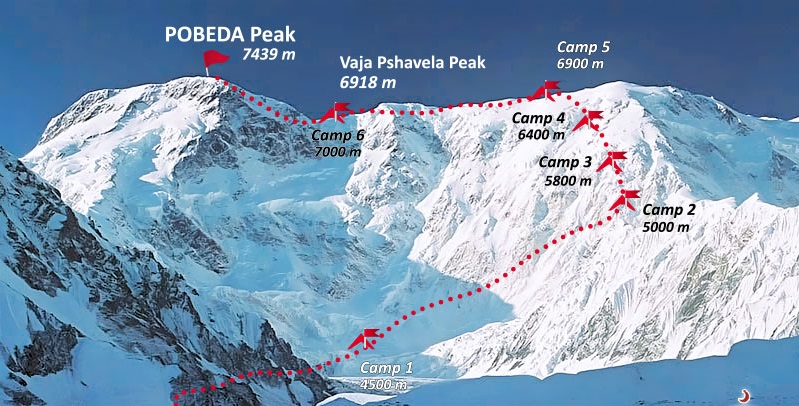 La ruta del Campo Base “Inilchek Sur” hacia el Campo 1 (4500m) es bastante simple, sólo ultimos unos cien metros del camino en el glaciar hay unas grietas. El descenso al Campo 2 (5000m) pasa a través del paso Dikiy por un salto de hielo abrupto; aquí los alpinistas deben moverse en la rapidez máxima porque de la pared norte del pico Pobeda hay avalanchas que a veces alcanzan el salto de hielo. El Campo 3 (5800m) se pone en la cueva de nieve. Por el camino al Campo 4 (6400m) se superan las rocas de categoría 2 y 3. La acsensión al Campo 5 (6918m) es por una cuesta escarpada de nieve y hielo. El Campo 5 está en la parte del Sur (de China) de la cuesta de cima. El camino del Campo 5 al pie de la pirámide de cima es a lo largo de la cresta larga de nieve (sobre 2 km de longitud) en la altura de 7 mil metros. Durante el día hay que alcanzar la cima y regresar a la cueva de nieve – el campo junto a la Pobeda de oeste.