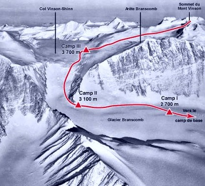 El Monte Vinson fue ascendido por primera vez en 1966, la ruta normal es bastante clara, y no muy difícilTrekking y escalada sobre terreno no marcado, con dificultades técnicas complicada, pendientes de 60% y más. Se sortearan obstáculos como escaladas en roca y glaciares con crampones y piqueta. Técnica de Rappel. Uso obligatorio de la cuerda para superar pasos de VI y VI+ grado y progresar en cordada. Con aristas y crestas aéreas con alto grado de exposición y duración. Con imposibilidad de poner seguros cercanos. Es necesario experiencia previa Más, con unas pocas pendientes de nieve de 40º. Hasta la fecha, poco más de 200 personas le han ascendido. Como expedición puede ser comparado a los últimos tres mil metros de un “ochomil”, con temperaturas y exigencias similares, pero sin la altitud.
