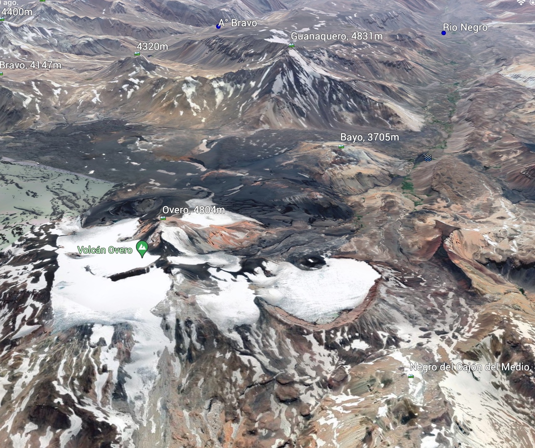 El volcán Overo es un gran macizo glaciar ubicado en la vertiente norte del río Atuel, cercano al borde septentrional de la caldera del Atuel, al suroeste de la provincia de Mendoza en el departamento de San Rafael. Su forma es descabezada, pero tiene un cono cumbrero en el extremo oriental del cráter principal. Su parte alta no es visible desde el valle del río Atuel, ya que el cráter está desplazado hacia el Este. Sólo deja ver su falda suroccidental donde están las antiguas instalaciones de la mina de azufre Sominar, abandonada a fines de los años 70 y desde donde comienza un camino (huella vehicular) de 36km que llega prácticamente hasta el cráter cubierto de hielo (4700m), rebalsando varias lenguas hacia sus laderas.